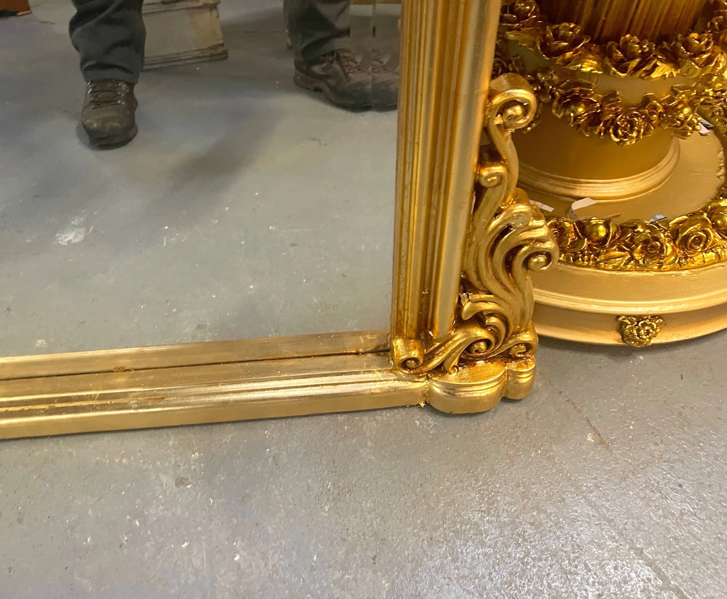 Carved wood overmantle . This is a solid wood overmantle Mirror with gold leaf frame and with beveled glass. Unlike a lot of other mirrors this is all wood without added decorations. I try to keep these in stock but they do sell out and take some time to make.