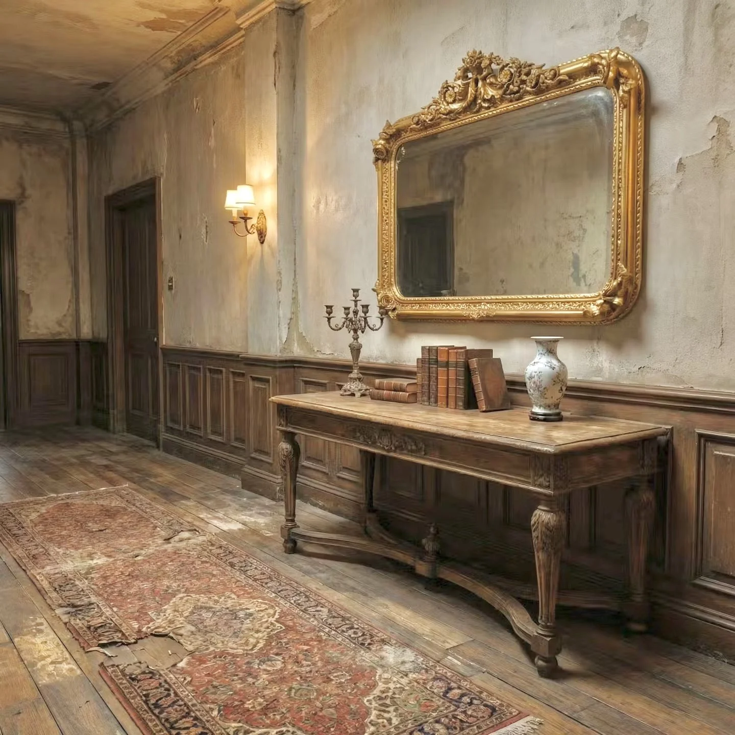 Medium sized horizontal mirror, very popular because of its size and price. This is gold leafed but due to its detailed frame it does not have the bright look as the smooth gold leaf. It has a solid wood frame but all details are added. A really good sized mirror at a great price.